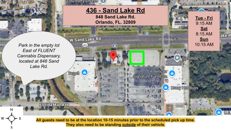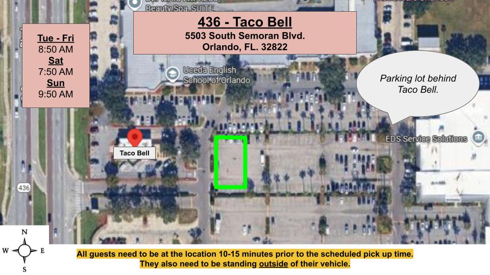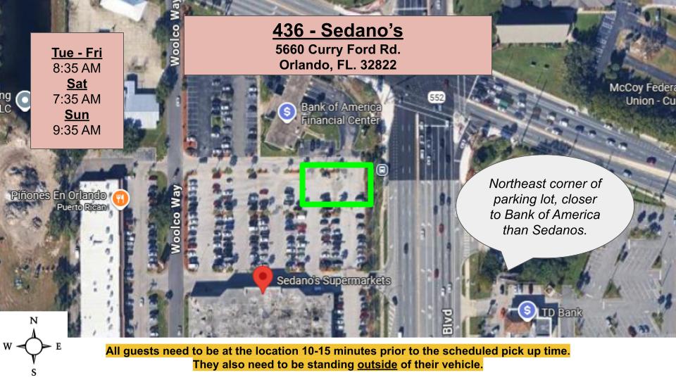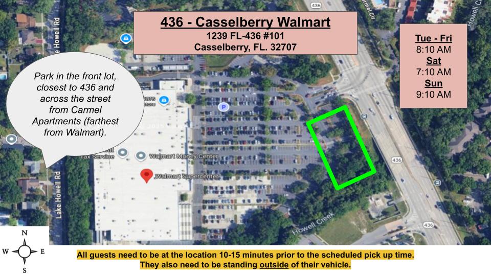Location: Walmart Main entrance off of Semoran. Make Immediate Left and park in lot area on left adjacent to Semoran Blvd.